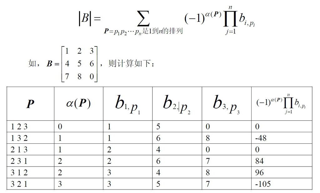 |B|=∑P=p1p2…pn是1到n的排列(-1)a(P) Πj=1n bi,pi