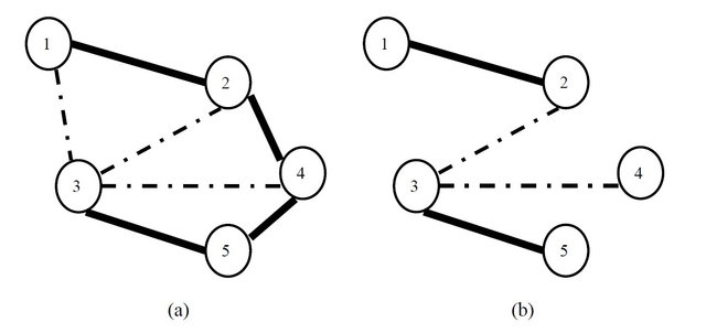 条鹅卵石路免费,那么可以如图3(b)中那样保持道路(1, 2)、(2, 3)、(3, 4)和(3, 5)