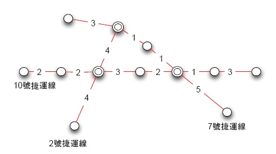 時間為: 1分鐘 (在捷運上等待離站) + 2分鐘 (到達2號站所需時間) + 1分鐘 (在捷運上等待離站) + 2分鐘 (到達 3號站所需時間) = 6分鐘。若以輸入範例第四個測資:12 7 2 1 10 1 為例,使用者於 12:07抵達 2號捷運線的 1號站,目的地為 10號線的 1號站,因此搭乘捷運所需的最短時間為:1分鐘 (12:10之捷運進站後搭上捷運並在捷運上等待離站) + 4分鐘 (到達 2號站所需時間) + 1分鐘 (2號線於 12:15到站後下車等待 12:18抵達的 10號線,上車並在捷運上等待離站) + 2分鐘 (到達10號線2號站所需時間) + 1分鐘 (在捷運上等待離站) + 2分鐘 (到達 10號線 1號站所需時間) = 11分鐘。 |