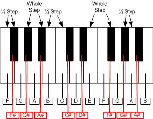 在鍵盤下方的是音符的音名,鍵盤上方的部份則表示全音和半音。這個鍵盤只顯示一部份的鍵而已。越往左的鍵音越低,越往右的鍵音越高。音符 A 到 G 會一直重覆。在一般音符 (白鍵) 之間還有額外的升音符 (黑鍵)。 移動到相鄰的鍵便是半音,移動兩個鍵的距離便是全音。注意,雖然 E 和 F (或 B 和 C) 是相鄰的白鍵,但是 F 和 G (或 G 和 A,或 C 和 D,或 A 和 B) 卻不相鄰,因為中間夾了黑鍵。
