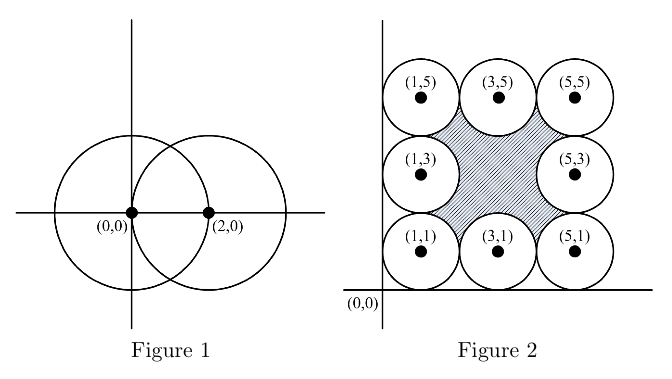 舉例來說,如圖1,城市中有兩顆炸彈,位置分別是 (0,0) 和 (2,0) ,它們的Red Area半徑都是2。因為兩炸彈的Red Area有互相重疊,所以可以被一條封鎖線包圍,封鎖線的總長度是16.76。再舉個例,如圖2,程式中有八顆炸彈,位置分別為 (1,1) , (1,3) , (1,5) , (3,1) , (3,5) , (5,1) , (5,3) 和 (5,5),它們的Red Area半徑為1,八顆炸彈的Red Area包圍出一個獨立的安全區域(用陰影部分表示),所以需要的封鎖線包括了內部和外部兩條,兩條線的長度合為50.27。