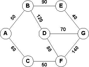 要從路口 A 到路口 G,你可以走這樣的路徑:A-C-F-G,而你必須忍受的最大噪音就是 140 分貝。如果你走的路徑是 A-B-E-G,或 A-B-D-G,或 A-C-F-D-G,那你必須忍受的最大噪音分別是 90, 120 和 80 分貝。當然還有其他路徑,但是明顯的 A-C-F-D-G 是最舒服的路徑了,因為你不必忍受超過80分貝的噪音。