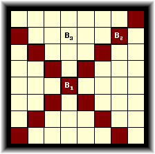 有玩過西洋棋吧!其中主教(bishop)是以對角線來移動,並且如果2個主教位於對方的移動路徑上則他們可以互相攻擊。以下圖為例說明:黑色格子為主教B1可以移動的路徑。從這個圖也可以看出B1和B2正處於可以互相攻擊的位置,但是B1和B3則否。同樣的,B2和B3也處於不可互相攻擊的位置。