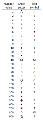 古希臘人用他們的字母來表示數字,解碼這些數字是翻譯古文獻中不可或缺的一環,這個系統如右圖所示,稱為愛奧尼亞數,使用了27個字母來表示十進位的1~9、10~90、100~900