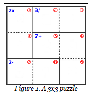一行中不會出現兩個相同數字,一列中也不會出現兩個相同數字,除此之外整個拼盤又分成許多小區間,每個區間有一個目標數和一個運算符號