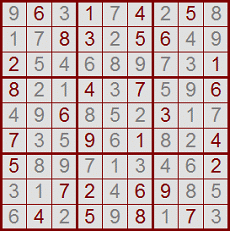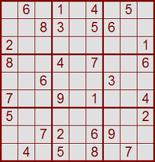 很多報紙上都有提供一種叫做「數獨」的遊戲,給你一個9*9的方陣,有些格子填有1~9的數字,有些格子則是空白。你的任務是完成這個方陣,使得每一列(橫的),每一行(直的),以及每一個小九宮格中的數字都剛好是1~9。