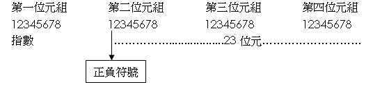 其中第一個位元為該浮點數之正負符號(0代表正,1代表負),第二位元組的後7位元和第三、四位元組的16個位元合成23位元的浮點數 |