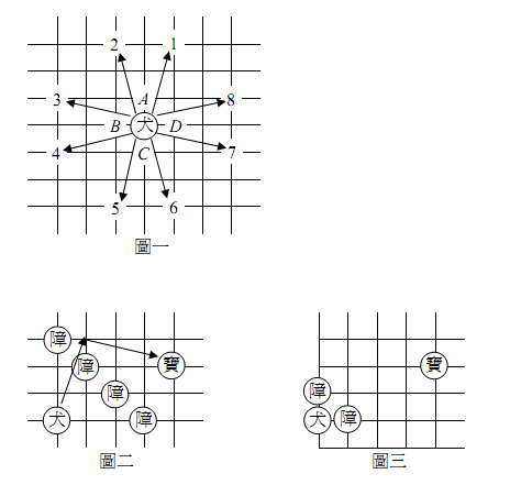 正方形(左下角座標為(0,0),右上角座標為(99,99))的格網上,有一隻靈犬要尋找一個寶物,格網上除了靈犬與寶物之外,還有一些障礙物。一般情況下,只要不超出格網的邊界,靈犬的每一步最多有8個方向可供選擇,如圖一;但是必須注意,只有在A點沒有障礙物時才可以選擇方向1或方向2,只有在B點沒有障礙物時才可以選擇方向3或方向4,只有在C點沒有障礙物時才可以選擇方向5或方向6,只有在D點沒有障礙物時才可以選擇方向7或方向8。如果靈犬可以從出發的位置走到寶物的位置,其總共使用的步數,理論上應有一個最小值;但是靈犬也有可能無法走到寶物的位置。過程中,靈犬不可以走到障礙物的位置上。