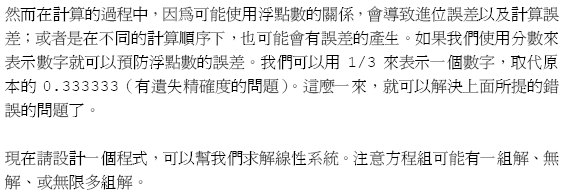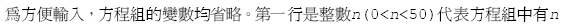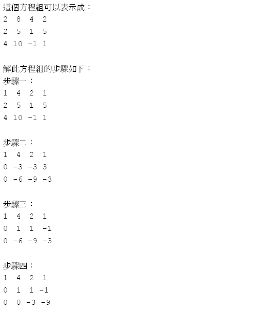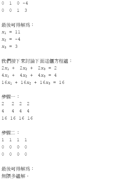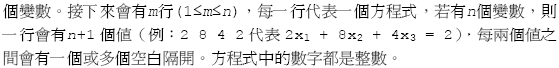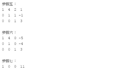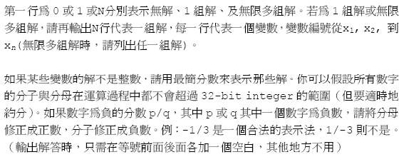 [Output 1] <-純粹標明是第幾筆的測資,您不用輸出這個東西。 1 x1 = 11 x2 = -4 x3 = 3 [Output 2] N [Output 3] 0 [Output 4] 1 x1 = 10/3