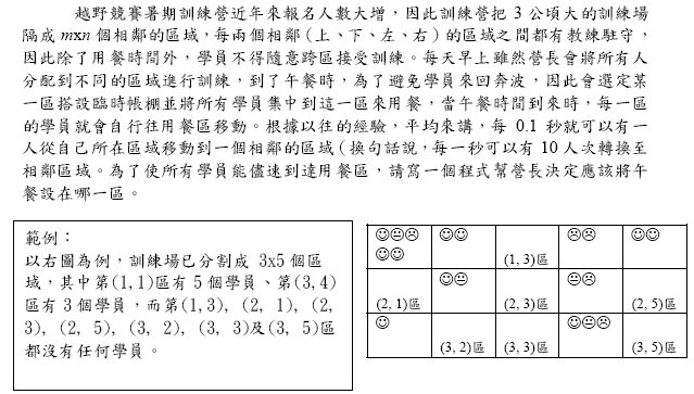 請輸出能最快讓所有學員都能集中到達用餐的區域代號。輸出時,不需要輸出刮號或逗點,只需要將代表該區的兩個整數輸出並以空白隔開。