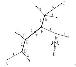 下面的图给出了树网的一个实例。图中,A-B与A-C是两条直径,长度均为20。点W是树网的中心,EF边的长度为5。如果指定s=11,则树网的核为路径DEFG(也可以取为路径DEF),偏心距为8。如果指定s=0(或s=1、s=2),则树网的核为结点F,偏心距为12。