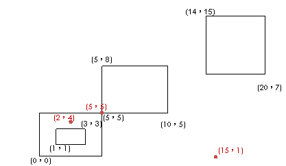 平面上有若干個矩形,任意給定一個點,我們要決定哪些矩形包含這個點,點落在矩形的邊界上也視為被包含,你的程式要計算包含這個點的所有矩形的面積和。