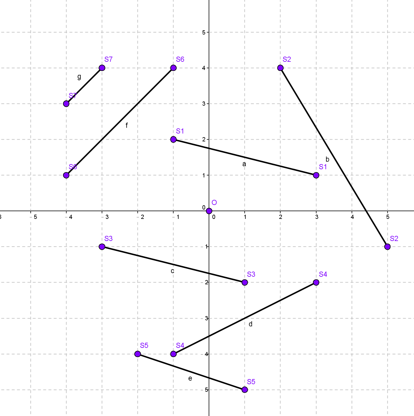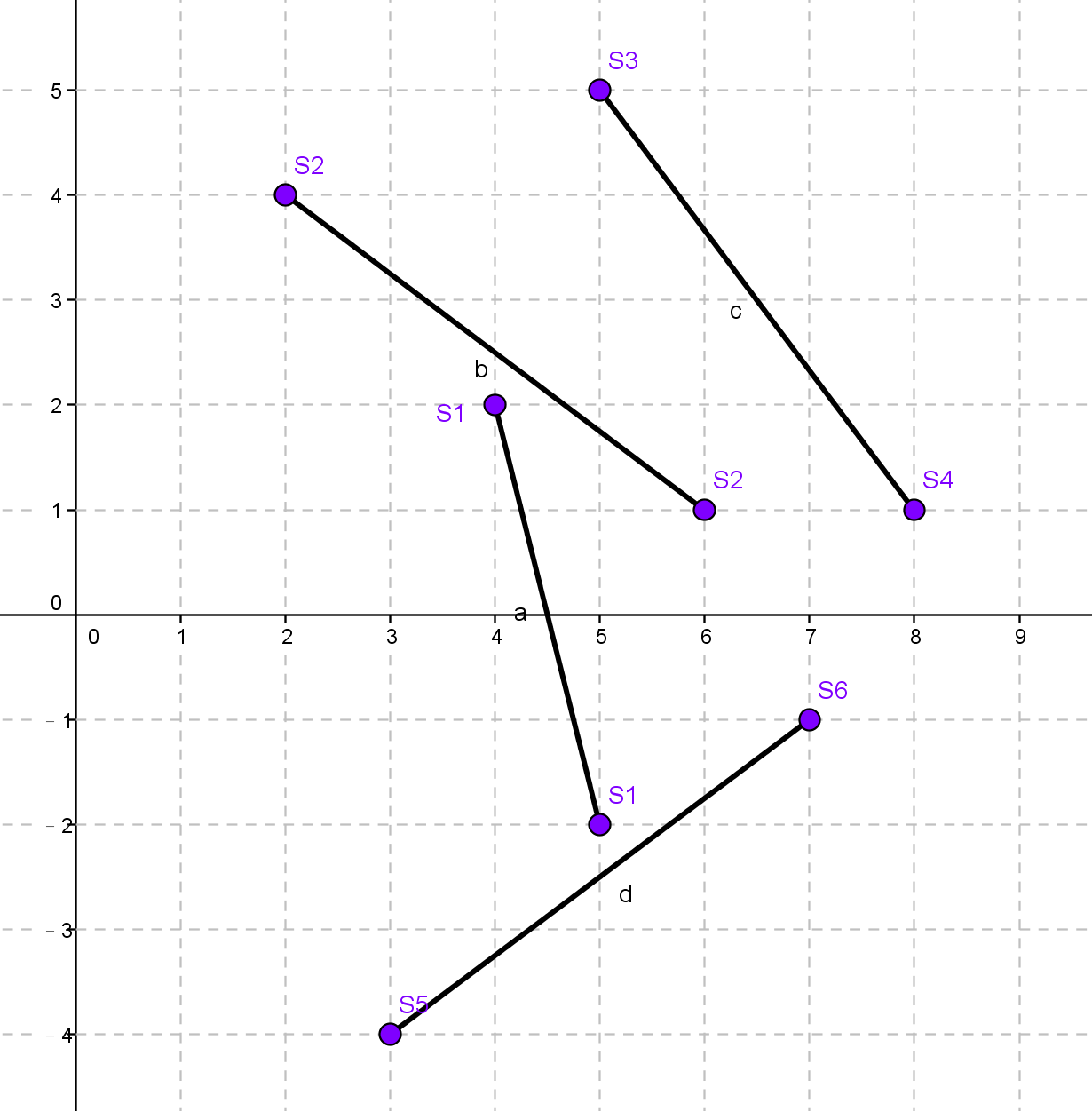 接著會有 $n$ 行,每一行上會有 4 個整數 $sx, sy, ex, ey$,表示鏡子所在的線段。