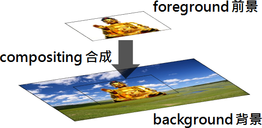 1. 學術上,這稱做Image Compositing,圖片合成。圖片合成有許多演算法,本題採用了最簡易的演算法 Alpha Compositing。Alpha Compositing的效果是半透明鬼影。因為效果太假了,所以大家鮮少使用此演算法,頂多用於視覺特效,例如過場效果。