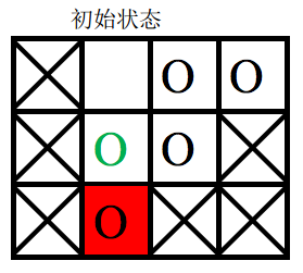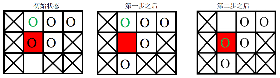 棋盘上划叉的格子是固定的,红色格子是目标位置,圆圈表示棋子,其中绿色圆圈表示目标棋子。