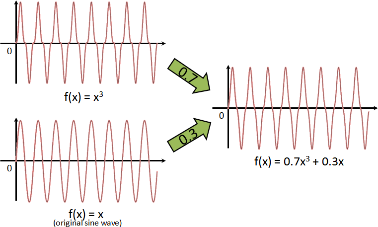 另外,還可以進一步運用合音的概念,混和各種調整過的波形,得到複雜的波形。例如f(x) = x3 與 f(x) = x 進行合音,比例是0.7與0.3。這可以整合成一個多項式函數:f(x) = 0.7 x3 + 0.3 x。