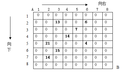 某人从图的左上角的A 点出发,可以向下行走,也可以向右走,直到到达右下角的B点。在走过的路上,他可以取走方格中的数(取走后的方格中将变为数字0)。