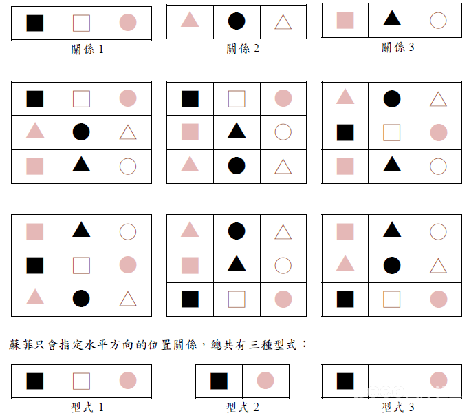 型式 1 表示她會指定某一列中三個巧克力的位置關係;型式2 表示她會指定某一列中相鄰兩個巧克力的位置關係,這兩個巧克力可能是靠左的兩顆,也可能是靠右的兩顆;型式3表示她會指定某一列中最左邊和最右邊的巧克力。要注意,蘇菲有時候只會指定巧克力的口味或形狀,不一定會同時指定。