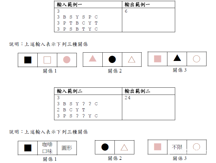 範例一: 3 3 B S Y S P C 3 P T B C Y T 3 P S B T Y C 範例二: 3 3 B S Y ? ? C 2 B C Y T 3 P S ? ? Y C