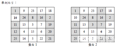 盤面1 中,共有14 個號碼可選擇,其中選擇10 可讓盤面分數為2,選擇18 可讓盤面分