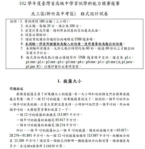每個測資檔有多組輸入(1~10組),每組輸入二列,每一列各代表一種披薩組合。第一個數字為披薩的個數N(1<=N<=20),以下為每個披薩的大小M(共有6吋、9吋、12吋、、16吋、及20吋五種大小),以空白隔開。