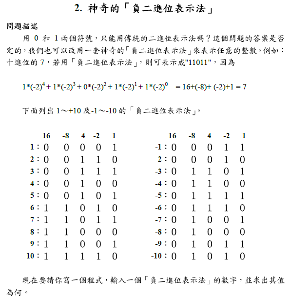 每個測資檔有多組資料(1~10組),每組資料有一列,其為一個「負二進位表示法」的數字,由0和1兩個符號組成,其長度介於1至16。