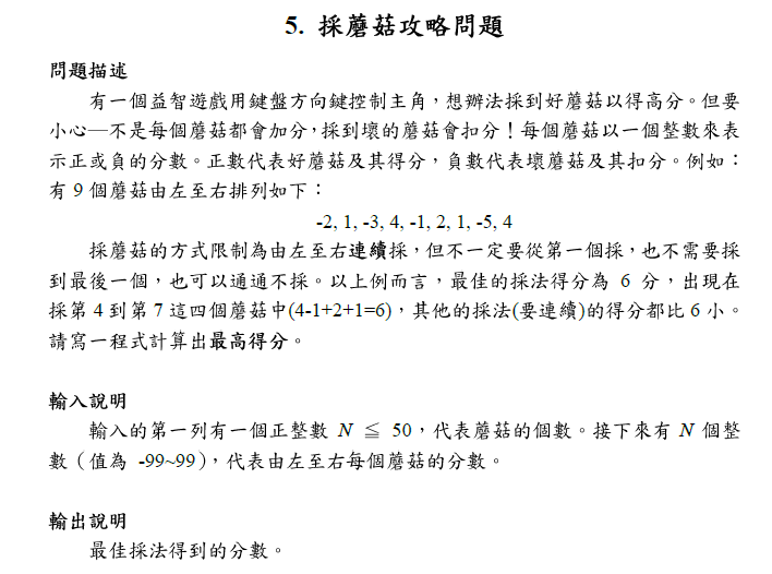 每個測資檔有多組資料(1~10組),每組一列,每列1個正整數字n,代表蘑菇的個數,接著n個整數(值為 -99 ~ 99),代表由左至右每個蘑菇的分數。