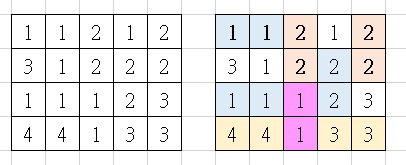 範例一:以下左為一個輸入範例: 而以下右為骨牌的例子:「骨牌」是數字相同且相鄰的兩格綁在一起。