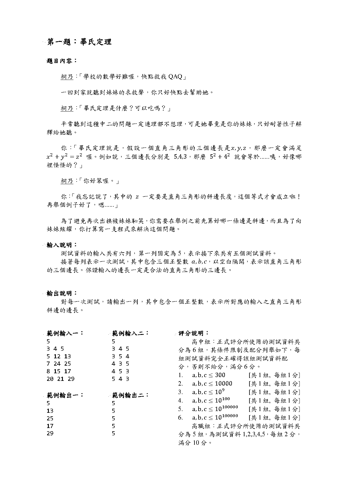 範例輸入一: 5 3 4 5 5 12 13 7 24 25 8 15 17 20 21 29 範例輸入二: 5 3 4 5 3 5 4 4 3 5 4 5 3 5 4 3