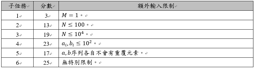 本題共有六組測試題組,條件限制如下所示。每一組可有一或多筆測試資料,該組所有測試資料皆需答對才會獲得該組分數。