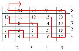 有一天,有一隻叫做小強的螞蟻來到一個M*M的棋盤上。他想要把棋盤的每一格都走過。他走的路徑有點奇怪,像一條蛇一樣,他走的速度是每秒一格(請參考下圖中紅色的路徑,代表1-25秒的位置)。