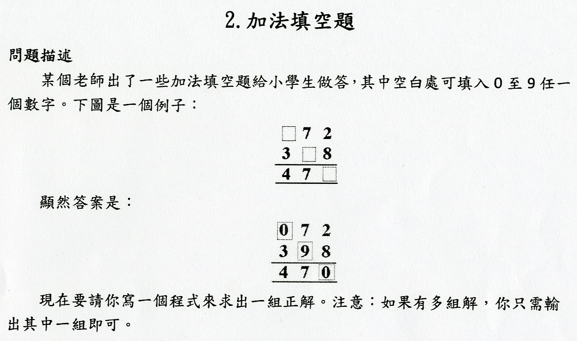輸入資料共有3列資料,每列都有n個(1<=n<=9)阿拉伯數字或「?」。如果是「?」,則表示是要填空的位置。