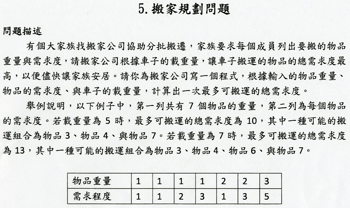 測試資料共有三列。第一列有A(1<=A<=1000)個以一個空格隔開的整數W(1<=W<=1000)代表物品重量。第二列同樣有
