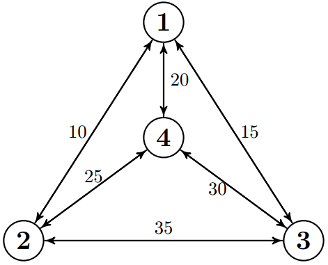 例如,走訪順序為 $1-2-4-3-1$. 距離總和為 $10+25+30+15 = 80$.