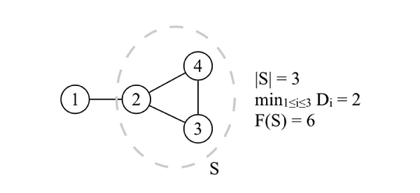 其中 $\color{black}{D_i}$ 表示選手 $\color{black}{P_i}$ 所認識的人當中,有多少人在子集合 $\color{black}{S}$ 裡面。 在以下這個 $\color{black}{4}$ 位選手的例子中,選 $\color{black}{S = \{2, 3, 4\}}$ 比其他的選法有更高的 $\color{black}{F(S)}$。