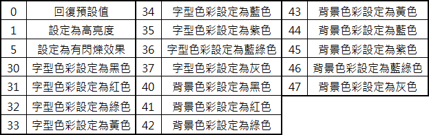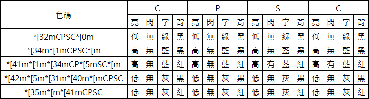而比較特別的是,「*[0m」因為太常使用了,故可以直接簡化為「*[m」。下列表格最左方一欄的色碼皆會輸出「CPSC」四字元,而右方四欄則分別表示出四個字元其分別的顯示效果(「亮」表示高低亮度、「閃」表示是否有閃爍效果、「字」表示字型顏色、「背」表示背景顏色):