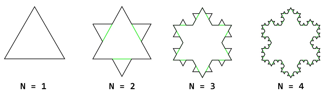 Koch 曲線是瑞典數學家 Helge von Koch 於 1904 年提出來的。它是一種碎形,其形態似雪花,又稱 Koch 雪花曲線。一開始給定一個等邊三角形,如下方左圖 N = 1 所示,它含有三個等長的線段。接下來 N = 2 的 Koch 曲線可以由以下步驟生成:
