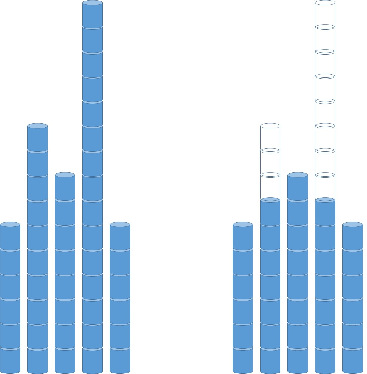 範例二:這個例子需要從第 2 個塔移除 1 個罐子,從第 4 個塔移除 4 個罐子後,才能完成符合最大高度差距的裝置藝術品。