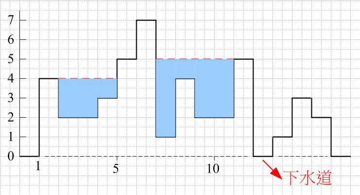 假設道路坑洞的形狀簡化如下圖所示,藍色區域為積水區域,總共的積水量(面積)換算為: