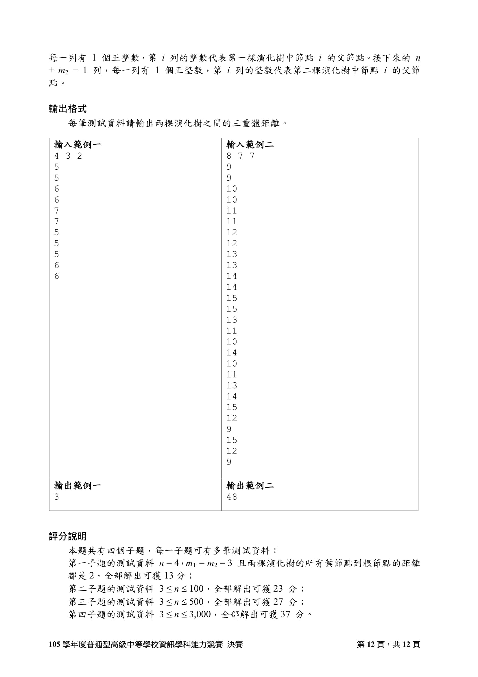 輸入範例一 4 3 2 5 5 6 6 7 7 5 5 5 6 6 輸入範例二 8 7 7 9 9 10 10 11 11 12 12 13 13 14 14 15 15 13 11 10 14 10 11 13 14 15 12 9 15 12 9