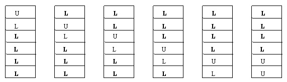 圖 2: 圖中的 L 表示那個抽屜是鎖著的,U 則表示沒上鎖。這就是可以確保剛好 4 個抽屜是安全的的六個組合。安全的抽屜以粗體字母來表示。