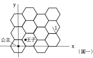 公主被俘在圍成一間間六角形的房間,如下圖,想過每間房間皆困難重重,驚險萬分,王子還是決心前往。我們能幫王子的,只有幫他找出一條最短的路,穿過最少的房間到達藏公主的所在,公主的位置永遠都是 ( 0, 0 )。