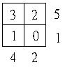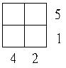 在一個 2×2 的格子圖形中,有三艘各佔一個格子的戰艦,戰艦的位置均在格子的範圍內。三艘戰艦重量皆不同,從 1 噸到 3 噸各有一艘,因為大霧瀰漫不知正確位置,僅知道每一列與每一行的總重量,請問聰明的你,知道每一艘戰艦的正確位置嗎?