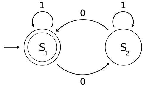 有限狀態自動機可以使用狀態轉移圖(State Transition Diagram)來表示,例如下面的狀態轉移圖,表示的是一個可以用來判斷二進位數是否具有偶數個 0 的有限狀態自動機。「沒有起點的箭頭」指向狀態 S1,表示狀態 S1 是開始狀態(Start State);狀態 S1 為雙重圓圈,表示狀態 S1 是接受狀態(Accept State)。