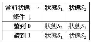 有限狀態自動機也可以使用狀態轉移表(State Transition Table)來表示,例如上面(上一頁)的狀態轉移圖可以表示為: