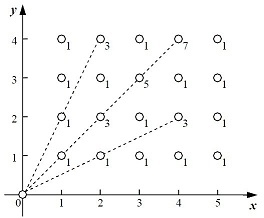 能量汇集机器在汇集的过程中有一定的能量损失。如果一棵植物与能量汇集机器连接而成的线段上有k棵植物,则能量的损失为2k + 1。例如,当能量汇集机器收集坐标为(2, 4)的植物时,由于连接线段上存在一棵植物(1, 2),会产生3的能量损失。注意,如果一棵植物与能量汇集机器连接的线段上没有植物,则能量损失为1。现在要计算总的能量损失。