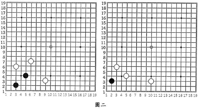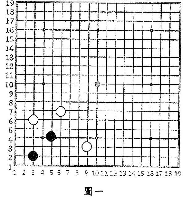 圍棋的棋盤是由 19 條縱線與 19 條橫線交錯所構成,如圖一所示。每一手棋都可以用三個數字(x, y, c)來表示,其中 x 和 y 表示這一個棋子的 x 座標和 y 座標,而 c 是表示棋子顏色。我們用數字 0 表示白色,用數字 1 表示黑色。以圖一的例 子而言,他有 5 顆棋子,記錄的方法為: