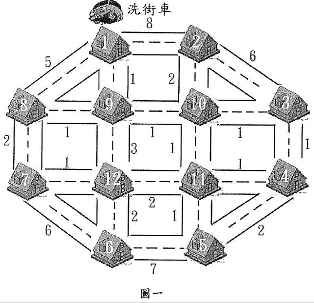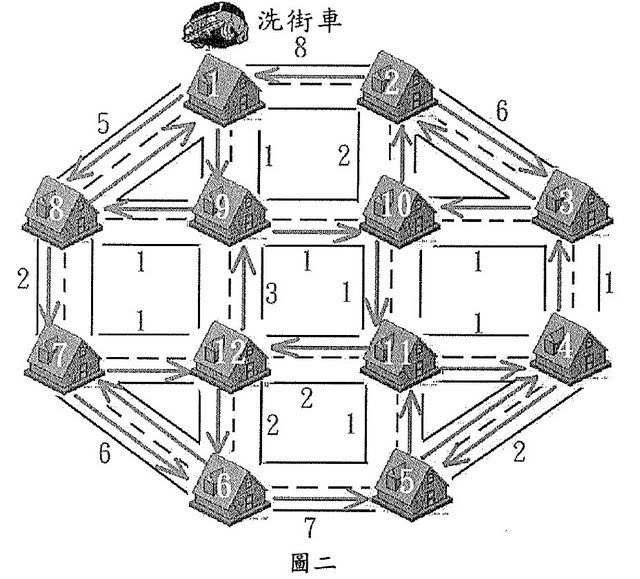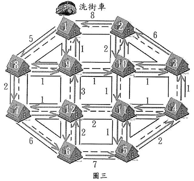 圖二說明其中一種走法為:1 → 8 → 1 → 9 → 8 一7 → 12 → 6 → 7 → 6 → 5 → 4 → 5 → 11 → 12 → 9 → 10 → 11 → 4 → 3 → 2 → 3 → 10 → 2 → 1,可在 73 單位時間將所有街道都清洗過至少一次,然而此種走法所需的時間並非最短。事實上,此例中花費時間為最短的走法如圖三所示為 l → 8 → 9 → 1 → 9 一8 → 7 → 6 → 12 → 7 → 12 → 6 → 5 → 4 → 11 → 5 → 11 → 4 → 3 → 2 → 10 → 3 → 10 → 11 → 12 → 9 → 10 → 2 → l,所花費時間為 64 單位。