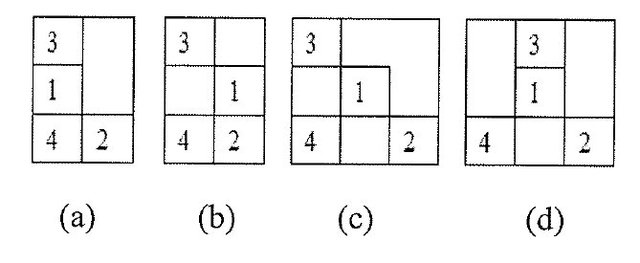 以下為一範例:假設李先生購買了 4 個長、寬皆為 1 的正方形磁磚,並將磁磚編號為 1~4,按照老闆的建議,這些磁磚的相對位置關係如下:2 要擺在 4 的右邊、1 要擺在 4 的上面、1 要擺在 2 的上面、3 要擺在 1 的上面、3 要擺在 4 的上面、和 3 要擺在 2 的上面。下圖列出四種滿足老闆建議的擺置方式,其中後二種方式 ((c) 與 (d)) 可分別用面積為 9 的矩形區域將其圍住,而前二種方式 ((a) 與 (b)) 則分別只需用面積為 6 的矩形區域將其圍住。就本範例而言,所有滿足老闆建議的擺置方式中最小的矩形面積為 6 ,所以你的程式必須回報 6 給李先生。