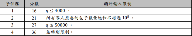 本題共有四組測試題組,條件限制如下所示。每一組可有一或多筆測試資料,該組所有測試資料皆需答對才會獲得該組分數。